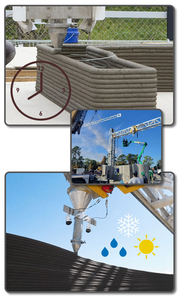 Speed to Market: Our 24-hour construction printing capability accelerates the building process, allowing for faster project completion. This rapid development reduces interest charges and speeds up the availability of housing units, addressing urgent housing needs more quickly.